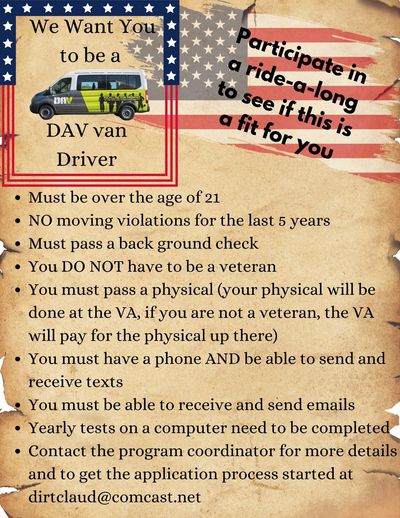 We are always looking for volunteers to drive the DAV van. This is NOT a paid position, strictly volunteer.