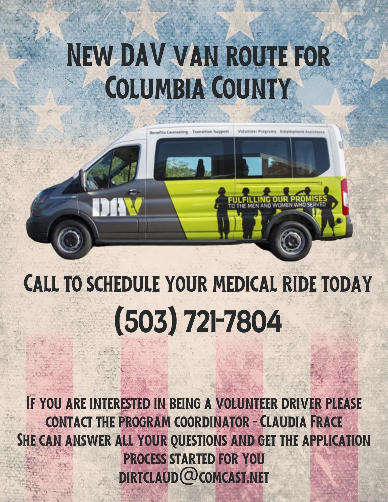 We are dedicated to serving our veterans with the utmost respect and care. The DAV van is for taking Veterans to their doctors appointments. You need to call (503) 721-7804 to schedule your ride.